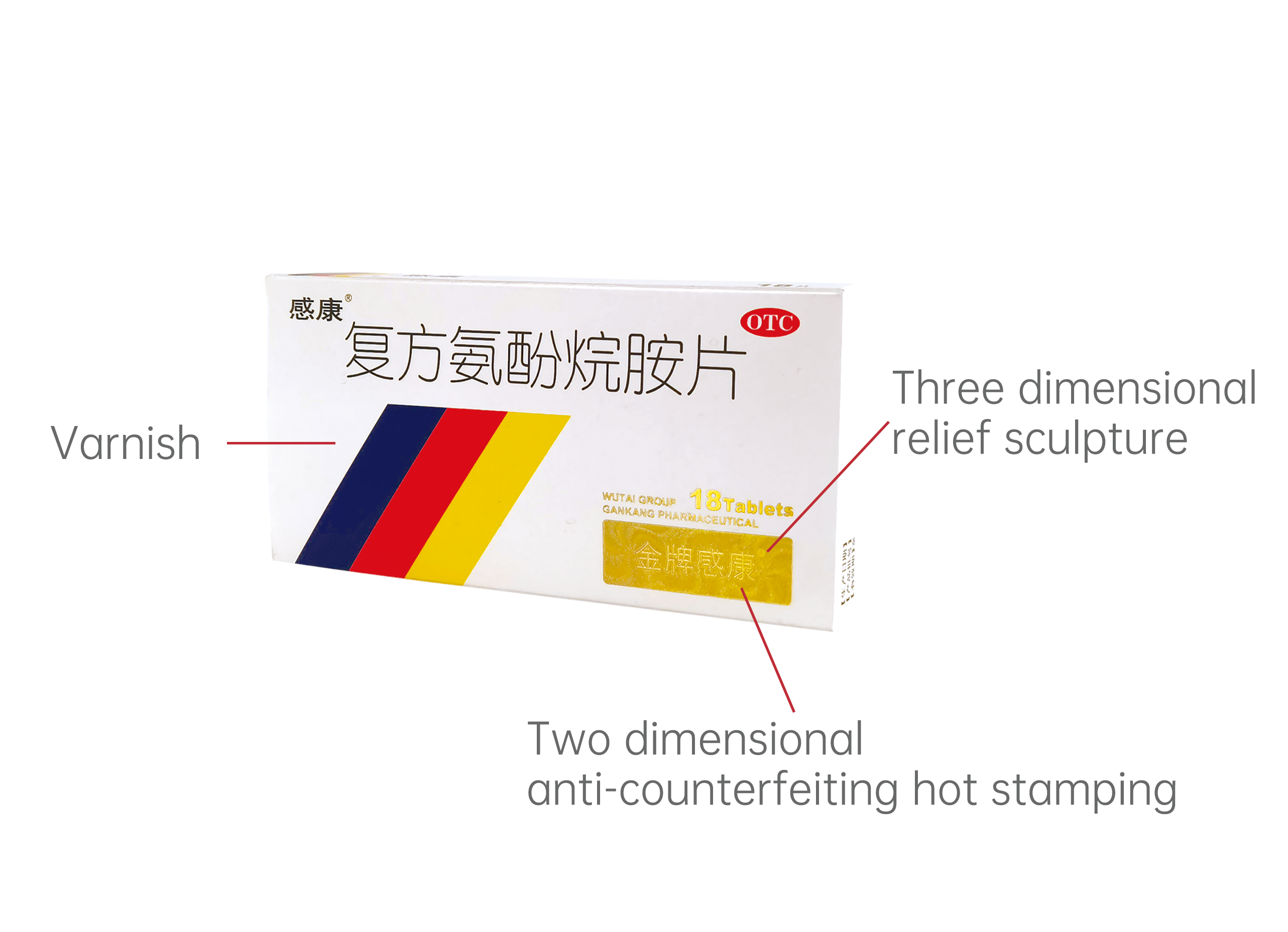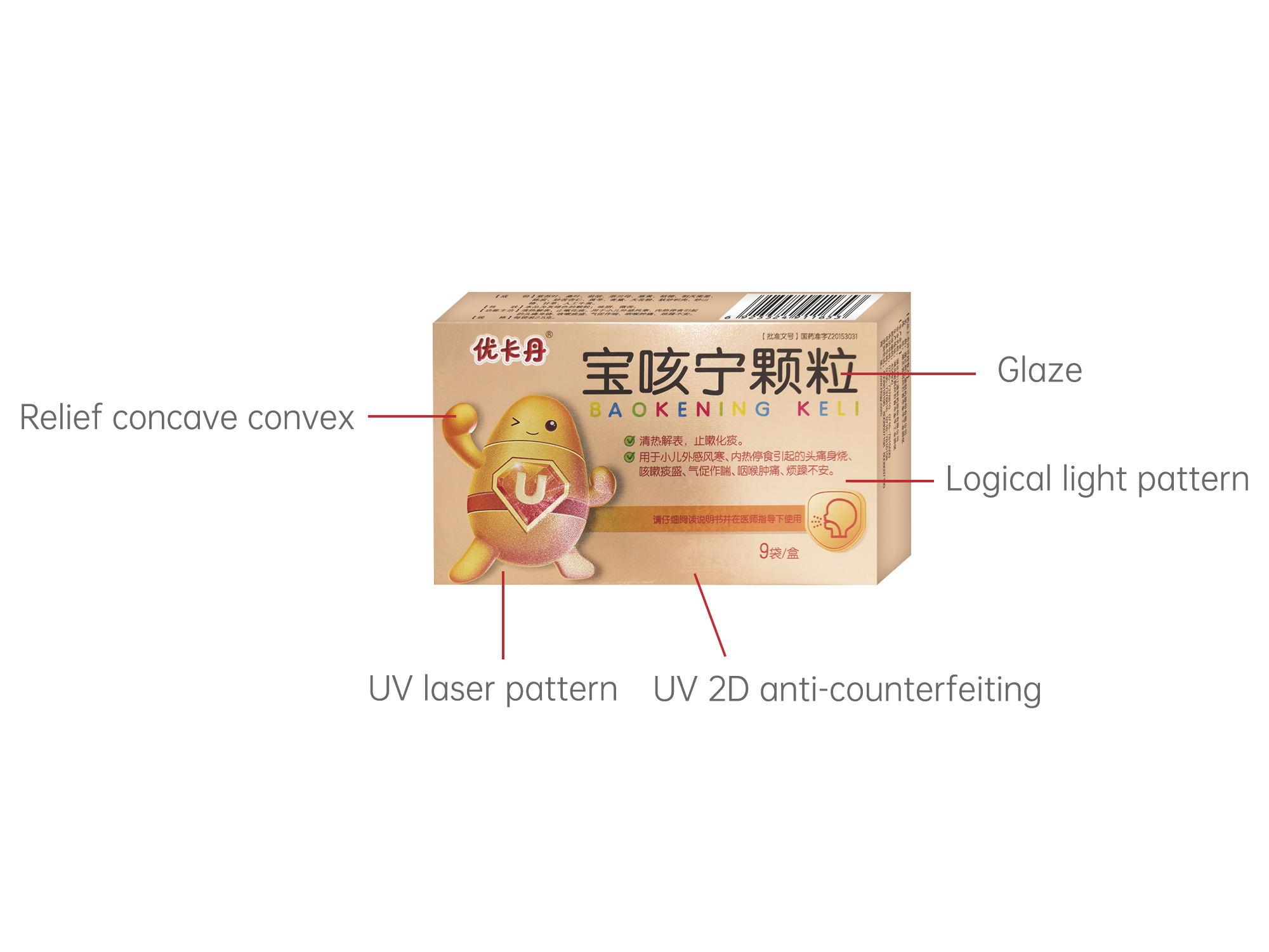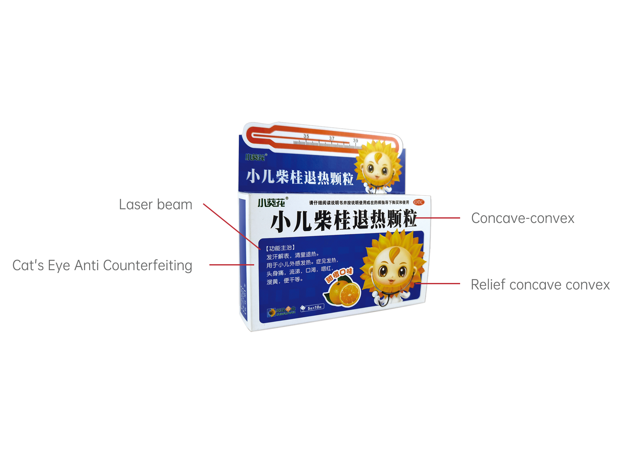 The dynamic anti-counterfeiting effect is achieved by using optical structure, the product has refractive changes, and a visually distinct convex feeling. The appearance of the main text is artistic and has a strong sense of three dimensionality, while presenting a striking metallic texture that attracts attention. The logical light pattern details of the background are clear, with a dynamic two-dimensional effect and strong visual impact. Under the illumination of a light source, rainbow colors appear. Shaking the paper box will also cause the rainbow colors to move, which is extremely beautiful. And it will not be limited by the prescribed form and content, and can be changed according to customer requirements, including the logical light pattern of the background and the overall metal color. This process has a special appearance effect, strong recognizability, and high anti-counterfeiting strength.