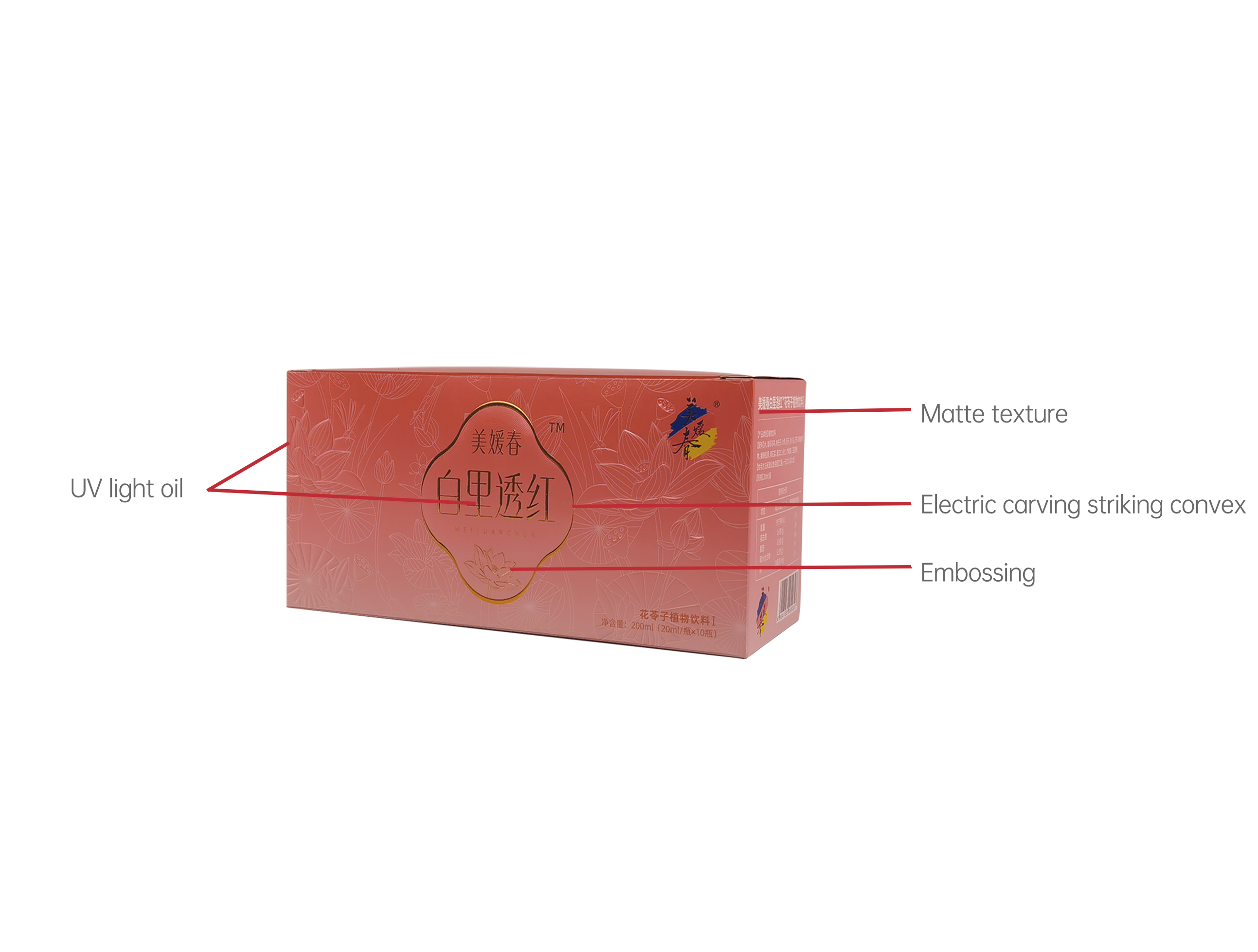 The combination of electric engraving relief plate and hydraulic technology is used, with relief plate stripes and background patterns as the base, combined with background patterns to create a relief program that produces a carved like concave convex effect on the image. Produce beautiful images, integrate various patterns and anti-counterfeiting elements to form complex anti-counterfeiting effects, and organically combine them with images to provide effective anti-counterfeiting measures without affecting the overall appearance. The texture of the handicrafts has been greatly enhanced, and the packaging box has a clear etching effect. The ink film is full and three-dimensional, and the handicrafts achieve a soft, solemn, and elegant beauty.